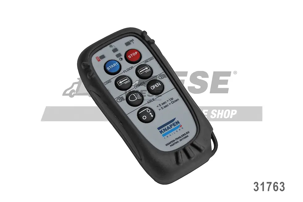 Die Knapen Trailer Fernbedienung bietet Ihnen volle Kontrolle über Ihren Schubbodenauflieger – bequem und einfach auf Knopfdruck. Mit dieser innovativen Fernbedienung lassen sich sämtliche Funktionen des Trailers, wie der Schubboden, mühelos aus der Ferne steuern. Dies sorgt für mehr Komfort, Effizienz und Sicherheit bei Be- und Entladevorgängen, da der Fahrer sich nicht mehr direkt am Fahrzeug aufhalten muss.