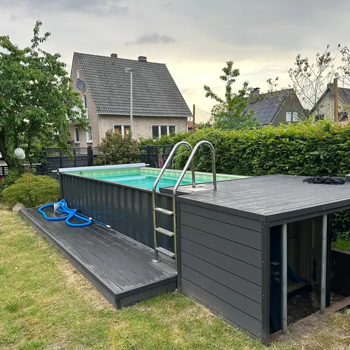 Wie auf dem Bild zu sehen, verfügt der Containerpool über ein hochwertiges Deck aus dunklen Terrassendielen. Es bietet Platz zum Sitzen, Sonnen oder Abstellen und sorgt gleichzeitig für eine edle Gesamtoptik. Der Einstieg erfolgt komfortabel über eine stabile Edelstahlleiter, die sich harmonisch ins Design einfügt.